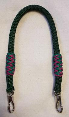 A 101 uses for this little gadget. Adjustable. Made with braiding cord. Can make any length but standard chin strap/bit hobble adjusts from about 7" - 10".