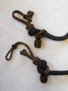 A unique design of Y Knot Rope Tack! I can make these in any of the 1/4" double braid rope so you can match or coordinate your reins and straps. They have a fiador knot and loops on one end to tie in your reins - just like on a rope halter. On the other end is a button / loop connector. To make the button, I tie what I call a crown knot. This is a unique knot that I came up with myself. The rope ends are secured by melting -- but on the sides of the knot instead of the top. So instead of a hard melted glob, there is a nice "crown" of rope that makes a button on the end of the loop. I then add a braided ring knot on the loop part that slides to open and close the "button hole".